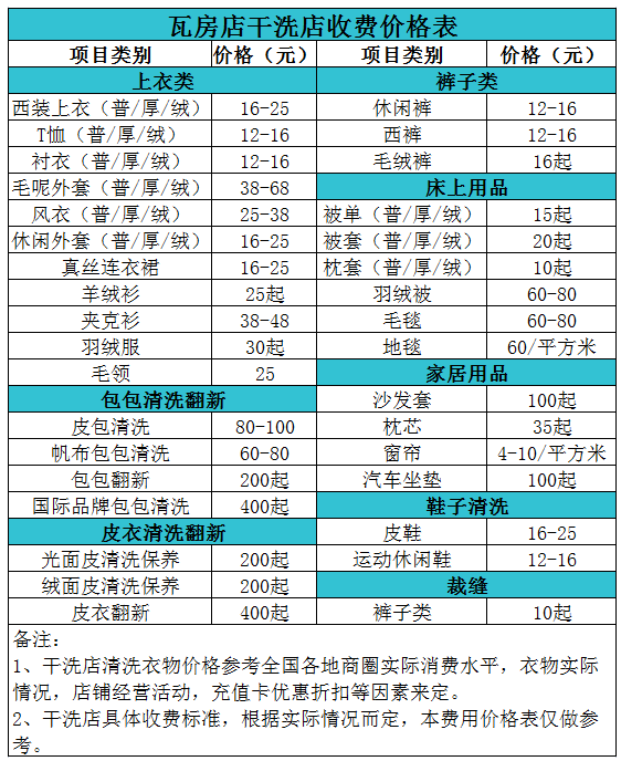 瓦房店干洗店收費價格表【詳細收費標準】怎么收費更賺錢