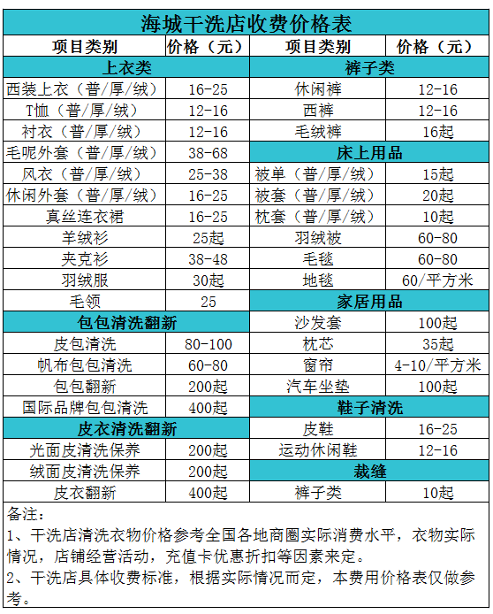 海城干洗店收費價格表【詳細收費標準】怎么收費更賺錢